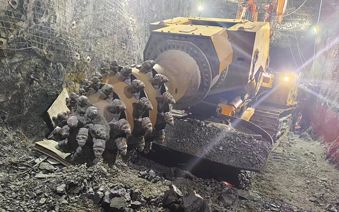 該礦施工斷面5m*4.5m,巖層硬度在60MPa左右,客戶所選購的徐工XTR7/360掘進(jìn)機最大截割高度7.2m,可實現(xiàn)中等斷面隧道一次開挖成型,切割頭配合硬巖截齒,掘進(jìn)時可以向巖壁施加每平方厘米1.5噸的力量,在機動靈活的基礎(chǔ)上兼具掘進(jìn)硬巖的優(yōu)勢。