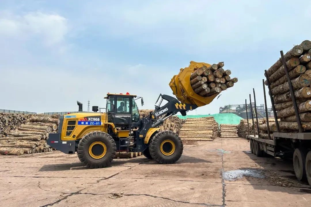 隨著滿載原木的貨輪緩緩靠岸,日照港瞬間切換為一派繁忙景象,20臺徐工XC968I夾鉗機迅速啟動、排列有序登上甲板,將原木從入港船舶上夾起、轉運至等待裝運的卡車,動作一氣呵成。