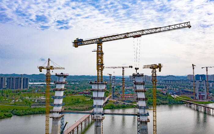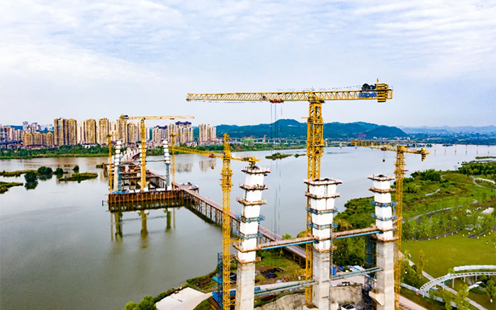 涪江六橋項(xiàng)目施工難度大、安全風(fēng)險(xiǎn)高,塔柱節(jié)段構(gòu)造復(fù)雜,異形塔柱節(jié)段需要塔機(jī)吊裝時(shí)能靈活轉(zhuǎn)向,同時(shí)施工材料距離橋面安裝高度較高,各鋼結(jié)構(gòu)更需要精準(zhǔn)對(duì)接,運(yùn)行平穩(wěn)精準(zhǔn)、吊裝能力強(qiáng)的XGT1350-64S、XGT6015-8S1成為項(xiàng)目的不二之選。