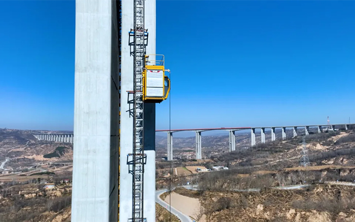 除了群塔助力,馬蓮河特大橋項目還使用了六臺徐工SC200/200FS1施工升降機(jī),零停機(jī)、零故障,整機(jī)性能優(yōu)越,應(yīng)用新型高可靠傳動機(jī)構(gòu)及高能效齒輪減速電機(jī),實現(xiàn)平穩(wěn)運行,保障鋼筋、水泥等建筑材料運輸安全,提高施工效率。