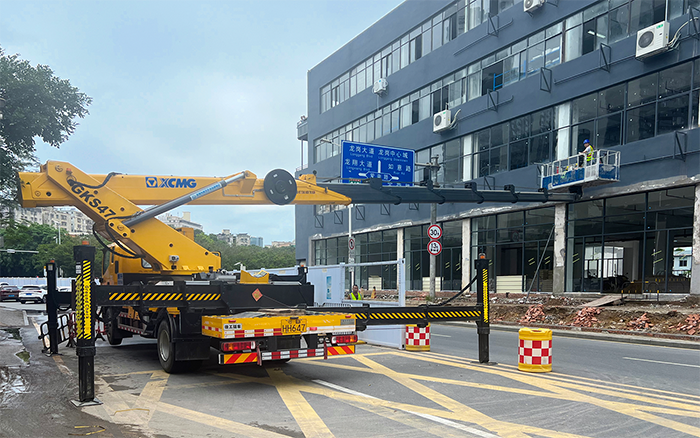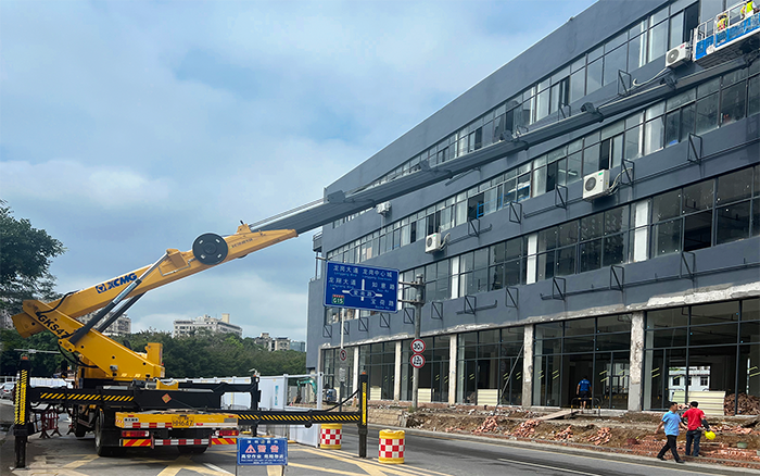 本次施工恰逢傍晚高峰期,時間緊、任務(wù)重,且水電路管道安裝需要長時間、高精準(zhǔn)的持續(xù)性作業(yè),對高空車性能要求較高。為避免占道施工阻礙交通,徐工GKS47高空作業(yè)車在街道對面的臨時停車區(qū)域快速展車,作業(yè)斗搭載3名施工人員和管路材料平穩(wěn)伸出20余米,橫跨整條街道,直抵商鋪外立面的作業(yè)地點,憑借獨有的高精度比例閥驅(qū)動控制技術(shù),實現(xiàn)微小流量的精準(zhǔn)控制,使工作平臺毫米級的位置調(diào)節(jié),便于工作平臺位置精調(diào);柔性制動讓操作更加舒適,能夠精準(zhǔn)識別操作員的操作意圖,制動體驗平穩(wěn)、低沖擊、小晃動,以“微動性、安全性、高效率、大跨距”產(chǎn)品特點完美應(yīng)對此次施工任務(wù)。