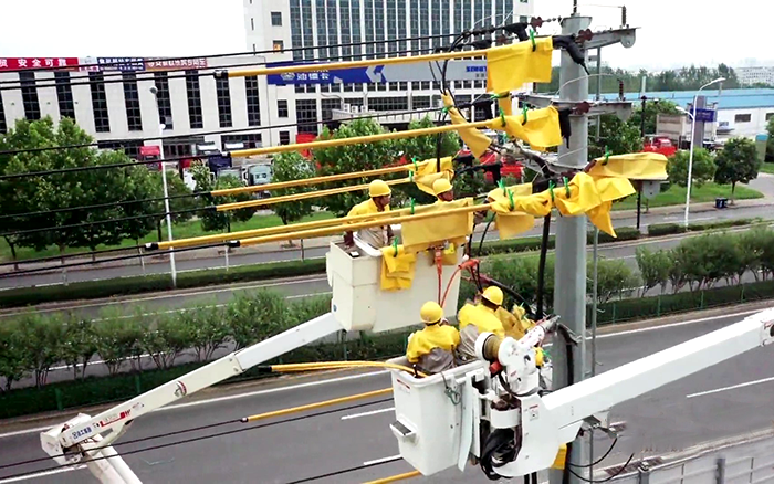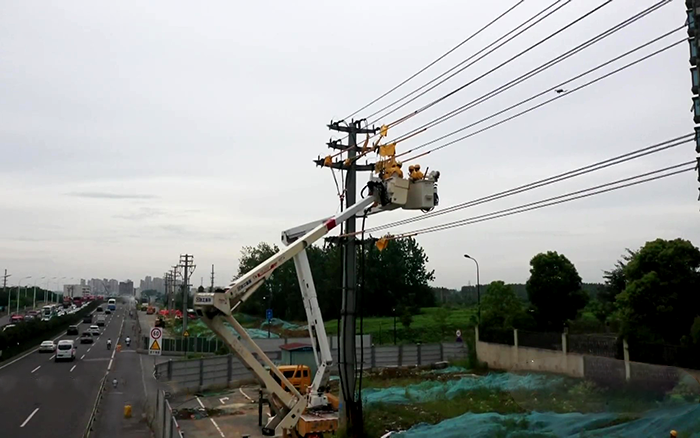 在電力桿線遷改施工現(xiàn)場(chǎng),4名帶電作業(yè)人員嚴(yán)格做好安全措施后,穿上黃色的絕緣服,乘坐徐工GKJH21絕緣斗臂車升入高空,將跨滁河大橋上的原10千伏泗水04線上電纜與架空線連接引線斷開,為當(dāng)日連接新建線路做準(zhǔn)備。整個(gè)施工過程高效、安全、平穩(wěn),獲得現(xiàn)場(chǎng)施工負(fù)責(zé)人的認(rèn)可。