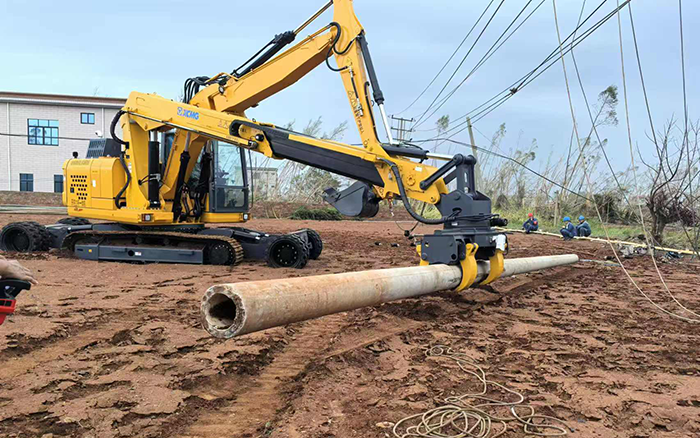 徐工開挖立桿一體機(jī)產(chǎn)品一車多能,平均每次新立電桿作業(yè)僅耗時(shí)20分鐘,是砼桿組立施工作業(yè)的革新式產(chǎn)品。相較傳統(tǒng)作業(yè)人力、吊機(jī)與挖機(jī)配合的方式,更具通用性、高效率和安全性,為本次臺(tái)風(fēng)搶險(xiǎn)救援行動(dòng)節(jié)省了大量的人力和時(shí)間成本,獲得施工方的高度認(rèn)可。