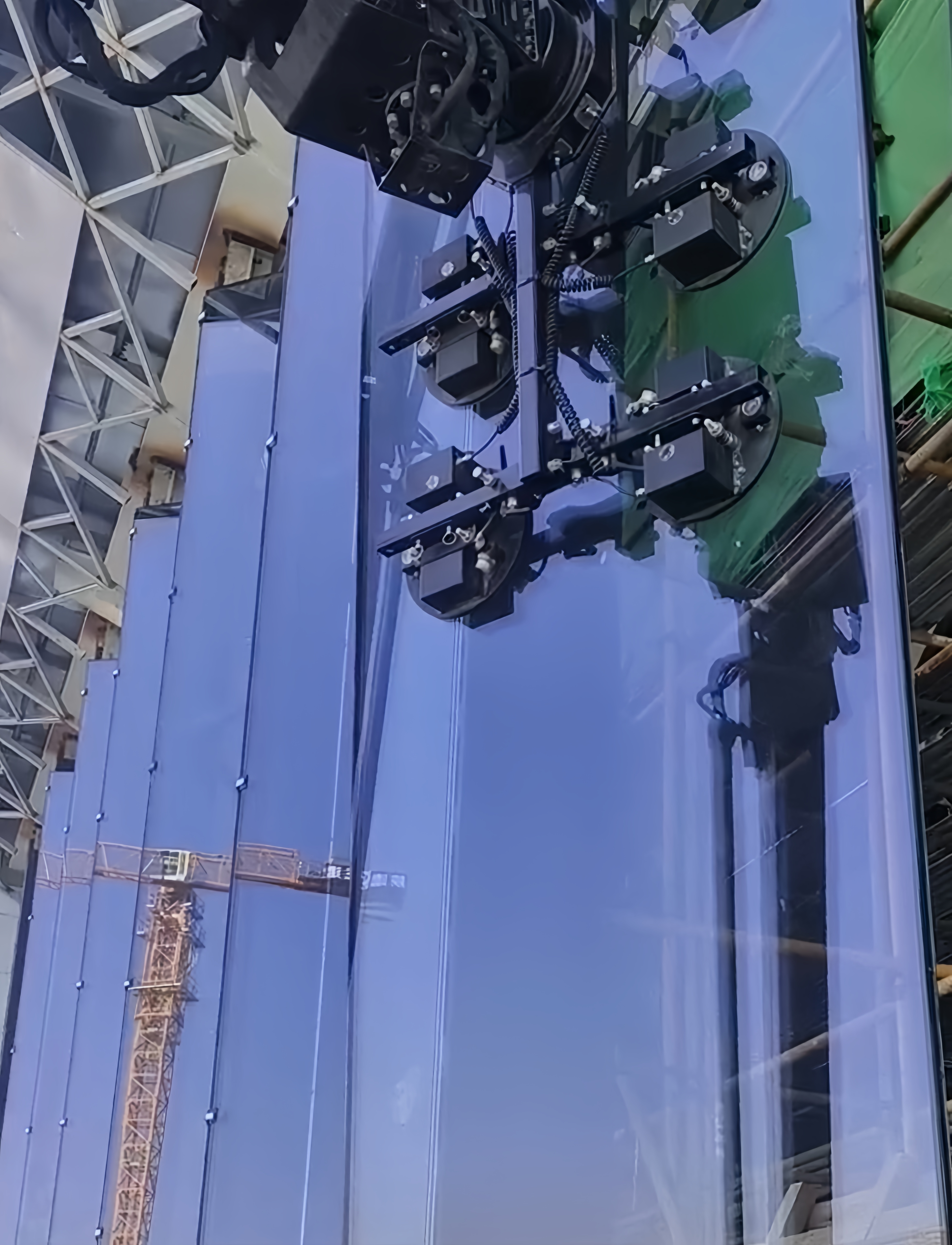 這是在西安大秦文化館玻璃幕墻安裝現(xiàn)場極其平常的一個場景,西安當?shù)貙I差異化設備的知名租賃商,在承接超大尺寸+超大重量的玻璃安裝時,摒棄了傳統(tǒng)依賴大量的人工,輔以吊車吊裝、吊機等工具抬高作業(yè)的情況,也避免了因受力不均或碰撞,造成玻璃損壞帶來的高昂損失,保障了施工人員安全。