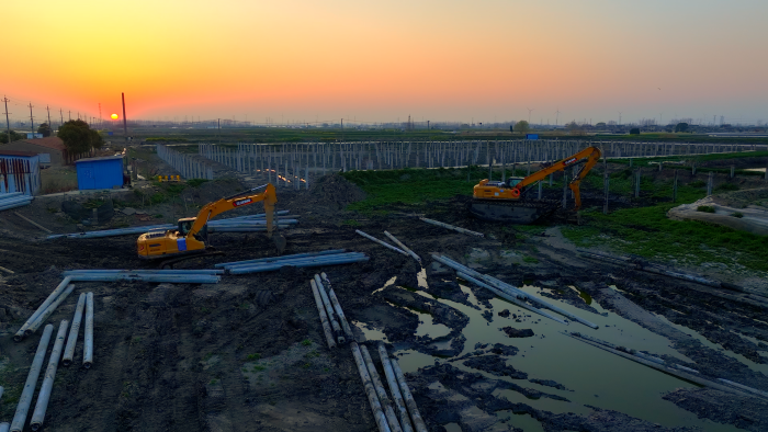 徐工XE270GK改裝水上打樁機,依托精準的操控和強勁的動力,將一根根10多米長的混凝土預制樁準確無誤地壓入指定的位置,為后續(xù)支架、組件、發(fā)電板安裝等關(guān)鍵環(huán)節(jié)的有序推進“保駕護航”。