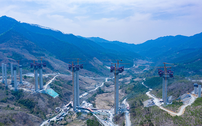蒼翠延綿的群山深處,一根根百米高墩拔地而起,自東向西整齊排列,二十余臺徐工S1系列塔機、施工升降機與青山比肩,正有條不紊地吊裝,助力雅長特大橋建設加速。