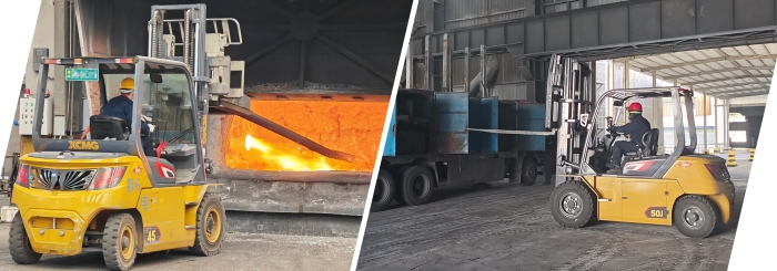 不止新疆,在華東某大型冶金廠,孔雀4.5噸叉車正在進(jìn)行爐前作業(yè);在華南電解鋁行業(yè)的強(qiáng)磁車間內(nèi),5噸孔雀叉車在進(jìn)行原材料搬運(yùn)工作。
