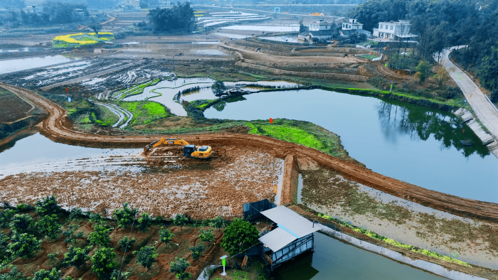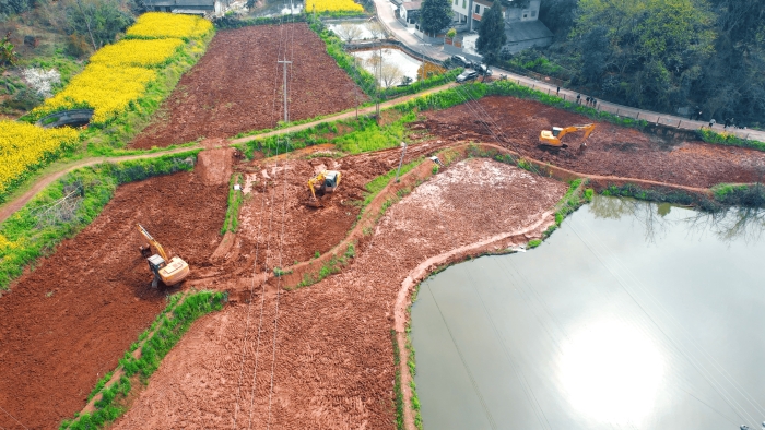 繼續(xù)向東,這里是萬里長江第一城——宜賓,在宜賓江安縣陽春鎮(zhèn),5000畝高標準農(nóng)田建設進入尾聲,項目高峰期投入30余臺徐工挖掘機。