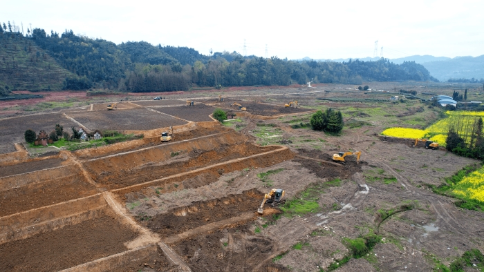 洪雅向東90公里,是仁壽縣,作為四川省產(chǎn)糧大縣,仁壽曾因田塊細碎導致機械化率不足。在5000畝的高標準農(nóng)田建設中,項目方集結18臺徐工挖掘機,以“日均30多畝”的速度搶抓工期。