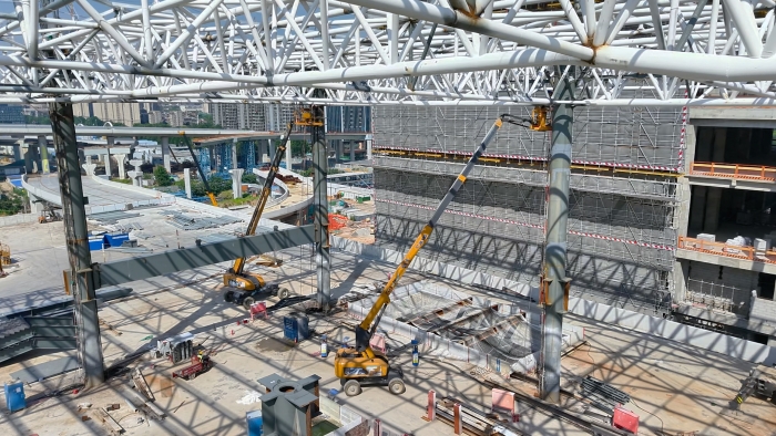 以徐工XGS40K為代表的十余臺(tái)徐工高機(jī)有的“一枝獨(dú)秀”,平穩(wěn)變幅直指站房屋頂;有的精準(zhǔn)定位,靈活探入桁架之間緊貼焊接點(diǎn),成為保障鋼桁架高空焊接作業(yè)的主力軍,熱火朝天的為祖國交通樞紐建設(shè)貢獻(xiàn)力量。