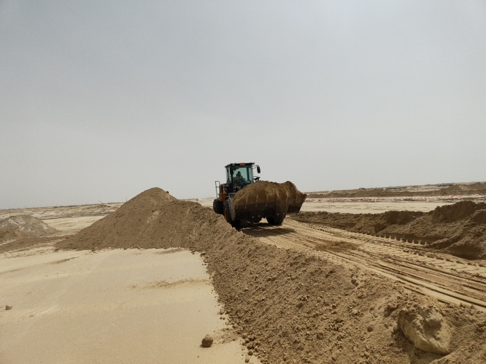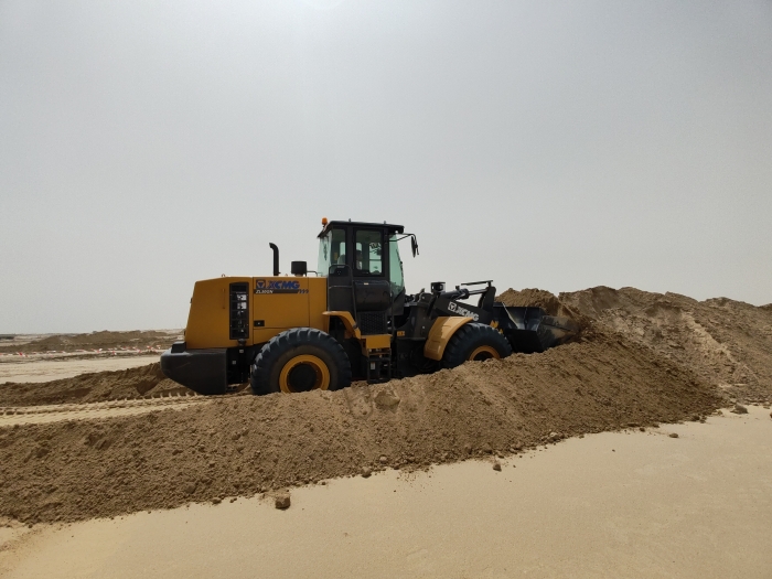 當(dāng)?shù)亟鸸忾W耀的沙漠地帶是極具標志性的景觀,數(shù)臺徐工ZL50GN裝載機正在其中緊張作業(yè)。擔(dān)負起土方搬運、路基平整、材料裝卸等關(guān)鍵任務(wù),在高溫、多塵的惡劣環(huán)境下依然表現(xiàn)出眾,成為不可或缺的重要力量。