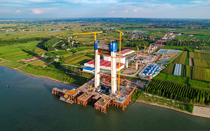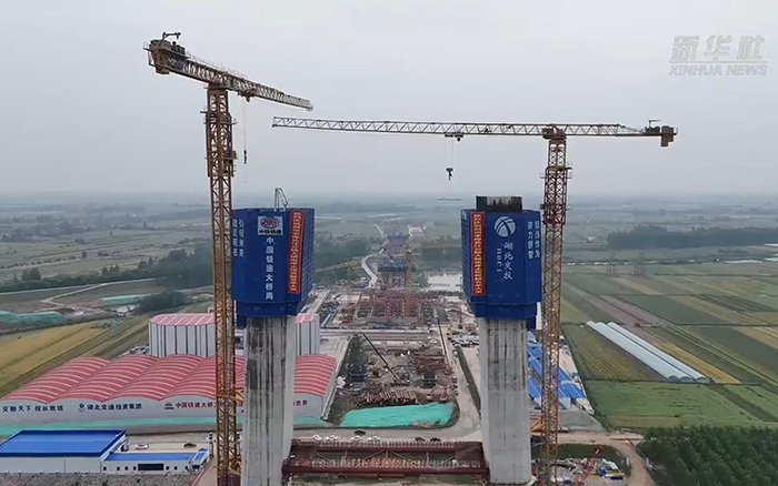 初秋時(shí)節(jié),長(zhǎng)江之畔,兩臺(tái)徐工XGT600A-25S塔機(jī)鐵臂揮舞,助力荊州李埠長(zhǎng)江公鐵大橋南岸主塔下游側(cè)第18節(jié)塔柱順利完成澆筑。