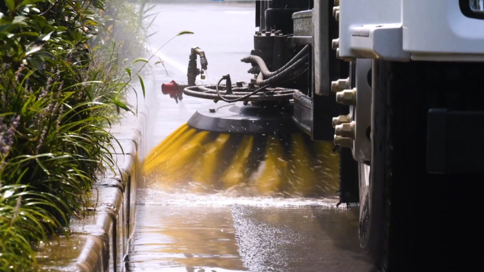 產(chǎn)業(yè)區(qū)周邊道路:運(yùn)輸車(chē)輛頻繁出入,易產(chǎn)生碎屑、油污。洗掃車(chē)搭載的高壓水槍與V型噴桿,可對(duì)路面進(jìn)行深度沖洗,油污去除率超95%,避免二次污染。