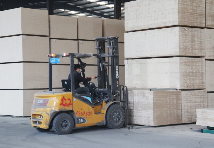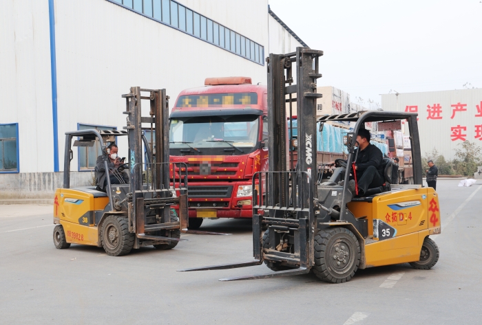 在山東菏澤某大型板材廠內(nèi),二十余臺(tái)徐工鯤鵬叉車(chē)、新E叉車(chē)組成的"黃金戰(zhàn)隊(duì)",以高效穩(wěn)定的作業(yè)表