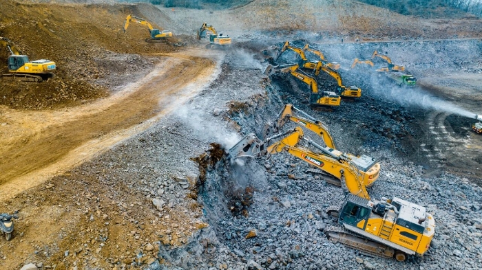 為確保工程節(jié)點,施工方經多輪方案論證,最終引入了14臺徐工挖掘機組成的主力設備集群,承擔核心的山體破碎及土石料裝車任務。在總量高達300萬方的工程面前,徐工XE650GK、XE380K、XE335GK等機型展現出強大的工況適應性。其中,8臺明星機型XE650GK配備215型破碎錘,憑借其獨有的破碎多級調頻控制技術,在面對高硬度玄武巖時日均破碎量穩(wěn)定在1500噸以上,同時將油耗控制在約40升/小時,實現了效率與節(jié)能的出色平衡。