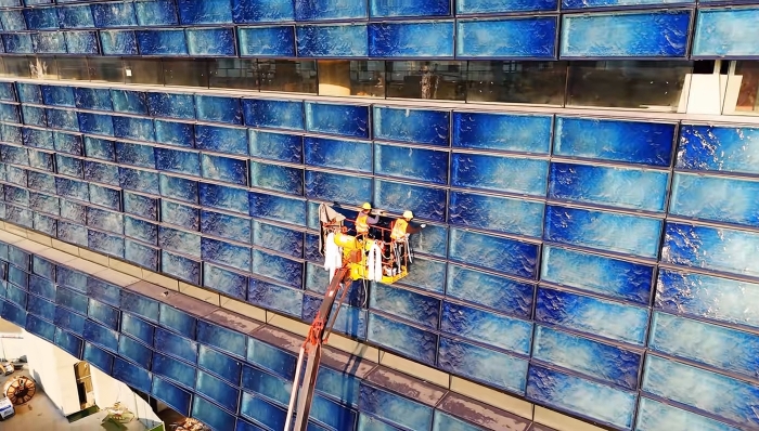 然而,將設(shè)計(jì)藍(lán)圖轉(zhuǎn)化為現(xiàn)實(shí),首先面臨的挑戰(zhàn)便是其獨(dú)特的外墻施工。建筑立面需安裝上萬(wàn)塊特制琉璃板,每塊尺寸達(dá)2.5米×1米,重量驚人地接近380公斤,且厚度存在精密的漸變。如此龐大且沉重的建材,對(duì)安裝作業(yè)的精準(zhǔn)度、穩(wěn)定性與安全性都提出了極為苛刻的要求。