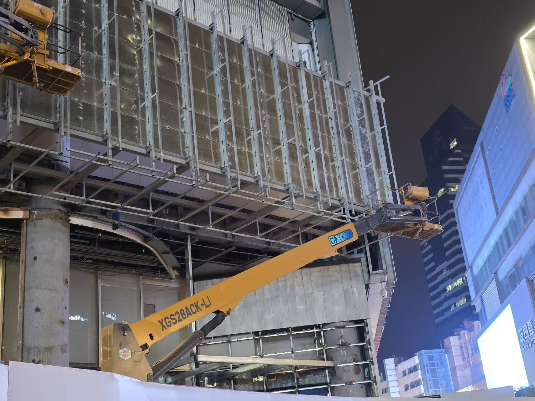 XGS28ACK-Li擁有28.8m最大作業(yè)高度,輕松覆蓋新百廣場(chǎng)高層外立面的幕墻安裝、鋼結(jié)構(gòu)拼接作業(yè)面;460kg的大承載量支持雙人協(xié)同施工,搭配靈活的臂架操作,大幅提升外立面改造的施工效率。更關(guān)鍵的是,設(shè)備采用鋰電驅(qū)動(dòng),實(shí)現(xiàn)零尾氣排放、低噪音作業(yè),即使在商圈白天運(yùn)營時(shí)段施工,也不會(huì)對(duì)周邊商業(yè)活動(dòng)造成干擾,完美適配核心商圈的施工管控標(biāo)準(zhǔn)。