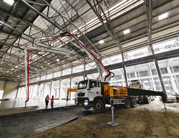 HB43V泵車搭載五節(jié)“RZ”型折疊布料桿,370°靈活旋轉(zhuǎn)無施工死角,憑借高效泵送能力適配大面積地坪連續(xù)澆筑需求,精準滿足C30混凝土強度與平整度標準。