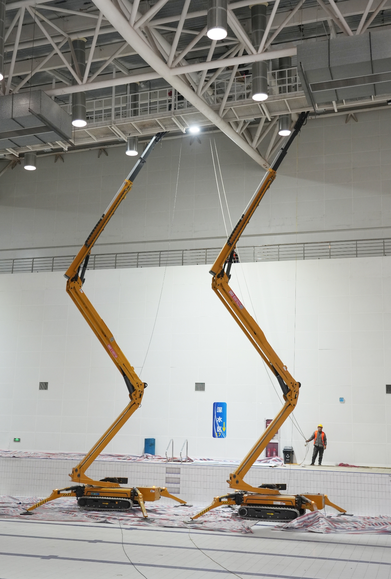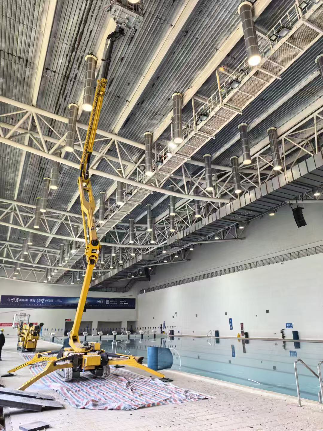 該設備采用履帶式底盤,自重4.6噸,接地比壓小,完美適配泳池低承重及地面保護作業(yè);車寬僅0.99m,可靈活穿梭狹窄通道,通行無阻;工作幅度可達15m,無需頻繁起降,省時高效,到場即可開工,此次施工僅配置3臺設備和10名操作人員,便能高效推進任務,在保障工程質(zhì)量的同時顯著縮短了工期,實現(xiàn)了效率與成本的雙重優(yōu)化。